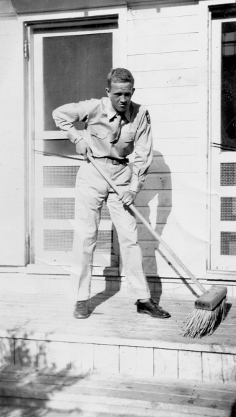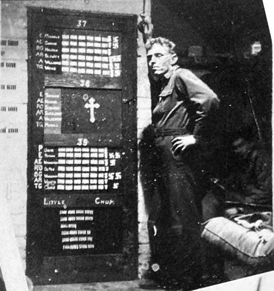 This photo captioned “Duff & Tiger” is from Weber’s scrapbook, possibly Pilot and Co-Pilot (CH Michael and DL Standquest) at their quarters. Might also be the Ground Crew Chief. Note the tally and kill marks for Crew 37/38/39, and the mention of 42-107025 Little Chum