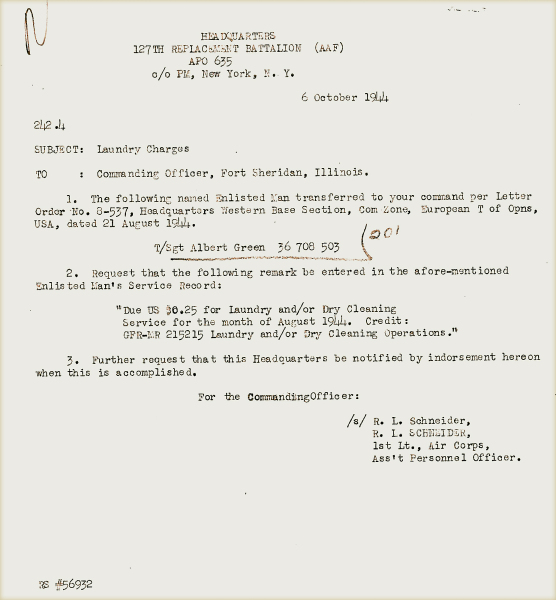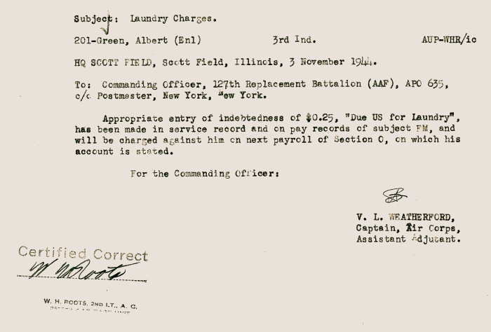 Via son Mike Green: There’s a bit of a story behind the Laundry Charges… When he was being discharged, my father purposedly sent his uniform to the base laundry to be cleaned and pressed one last time. Knowing he was done, he purposely left without paying, thinking he beat the US out of the laundry charges. They outsmarted him, by holding up his discharge papers until he paid the 25 cents…